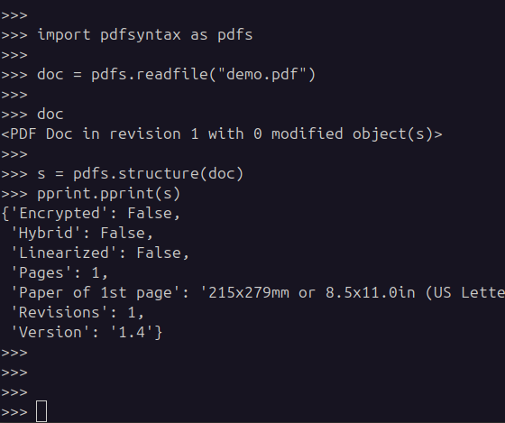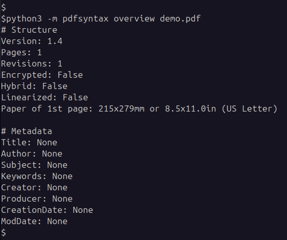Get quicky some insights about a PDF file from the command line, like the metadata, the fonts used, the text of the document,...